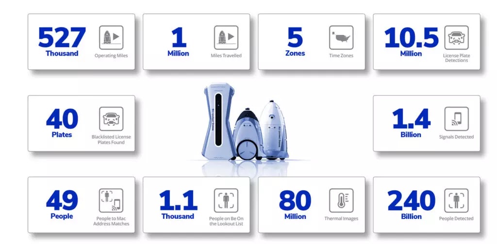 Knightscope also claims to have sent out 1,100 BOLO's to their customers, identified 49 people to Mac address matches and found 40 blacklisted license plates.